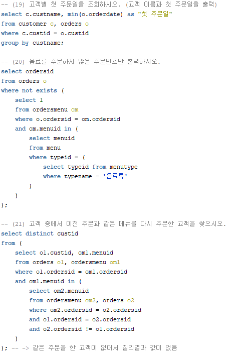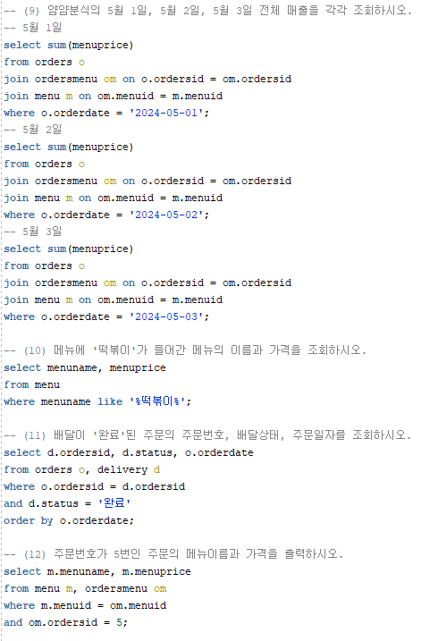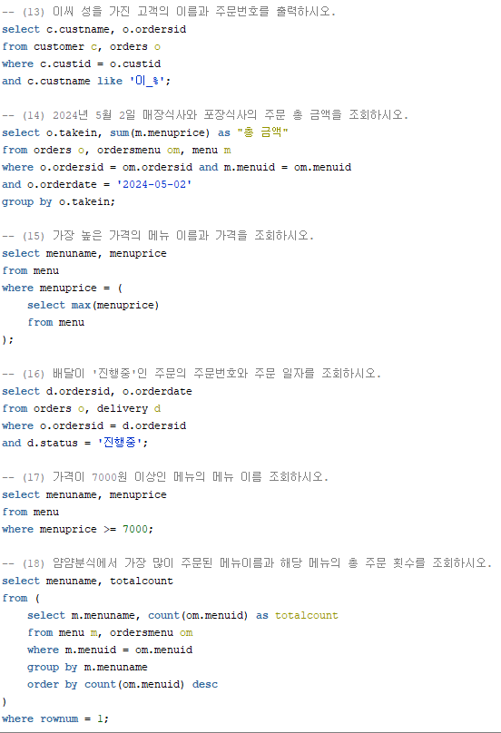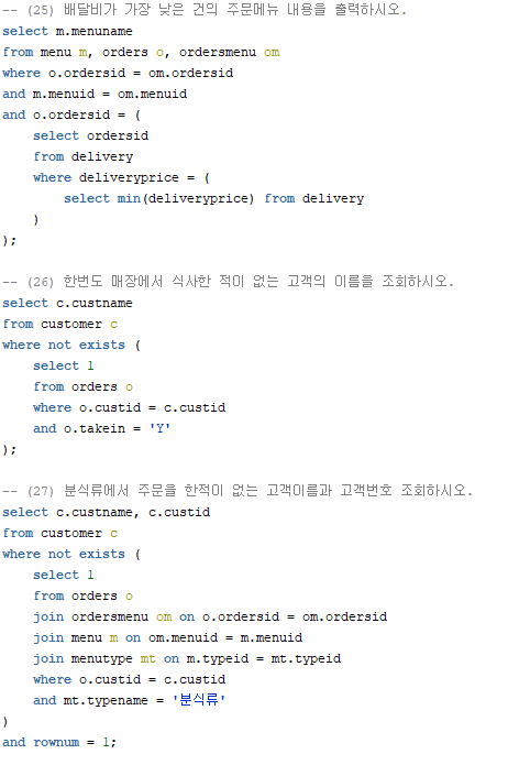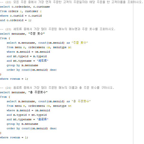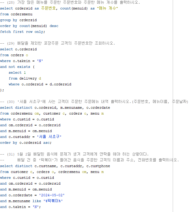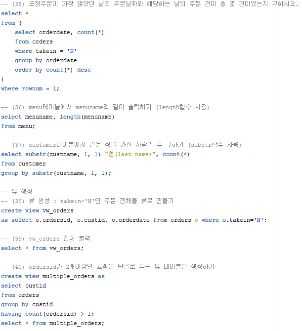 - (1) orders테이블에서는 주문번호, 매장식사여부, 주문날짜, 주문한 고객번호를 알 수 있는 데이터가 들어가있다.