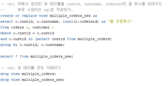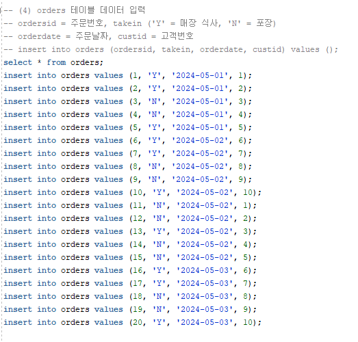- orders테이블은 ordersid, takein, orderdate, custid로 구성되어 있다.