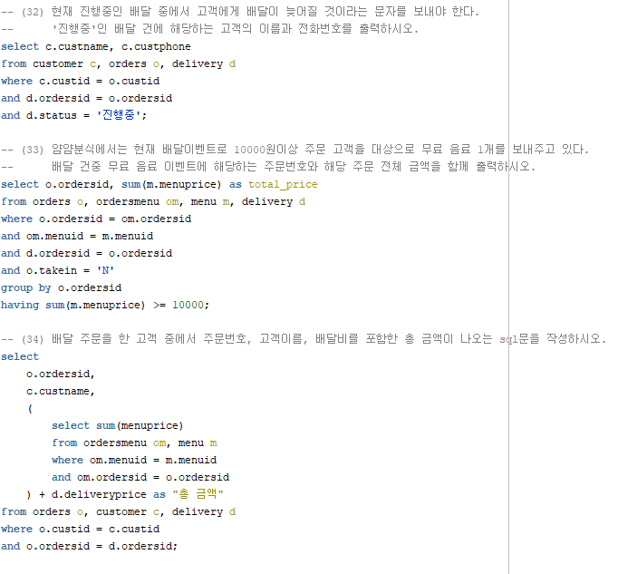 - (1) delivery테이블에서는 배달번호, 배달 상태, 주문 번호, 배달비를 알 수 있는 데이터가 들어가있으며,