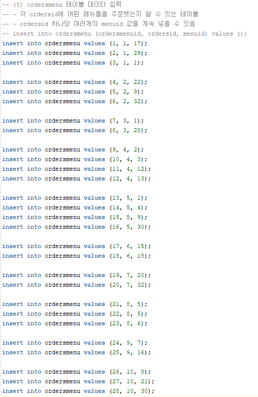 -- 8-(3) ordersmenuid는 메뉴의 개수에 따라 하나씩 들어오는 키이지만, 데이터를 관리하기 위해 지정된 기본키로