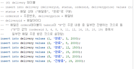 - (3) 배달은 orders테이블의 takein='N'인 값을 기준으로 일부가 delivery테이블의 deliveryid로 들어갔다.
