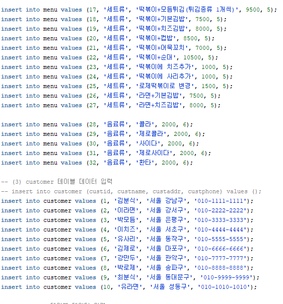 - (1) menu테이블에서는 각 음식의 이름과 가격, 음식 종류를 알 수 있는 데이터가 들어가있으며,