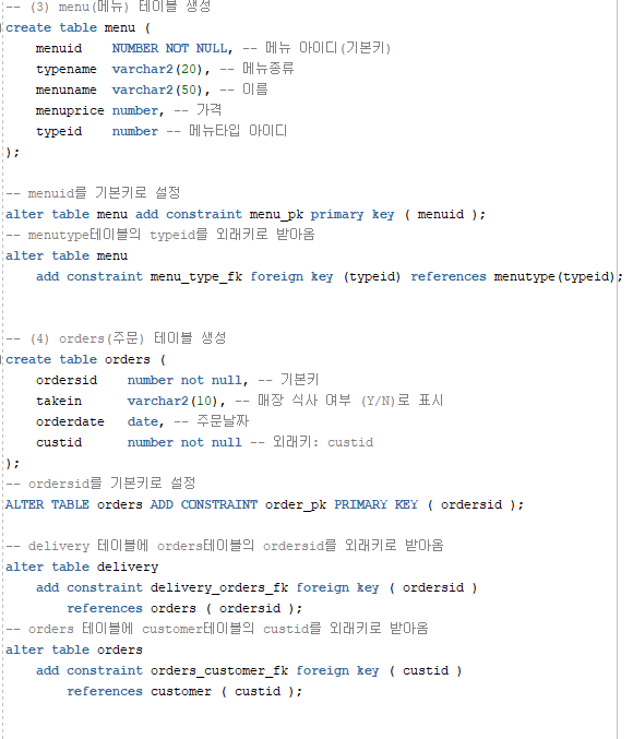 * 테이블은 총 6개로 구성되어있으며 menu, menutype, orders, ordersmenu, customer, delivery 테이블이 있다.