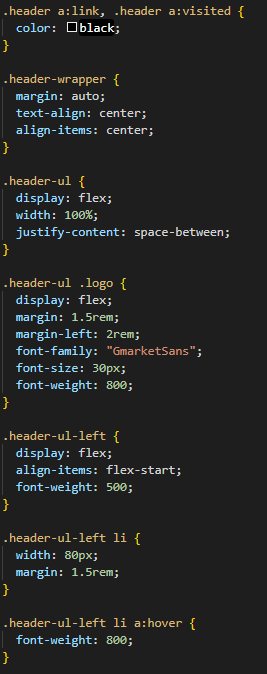 .header-ul-left 와 .header-ul-right를 따로 나누어서 왼쪽은 큰 카테고리 5 항목과 로고, 오른쪽은 돋보기 아이콘과 프로필(회원가입)아이콘 항목들을 두었다.