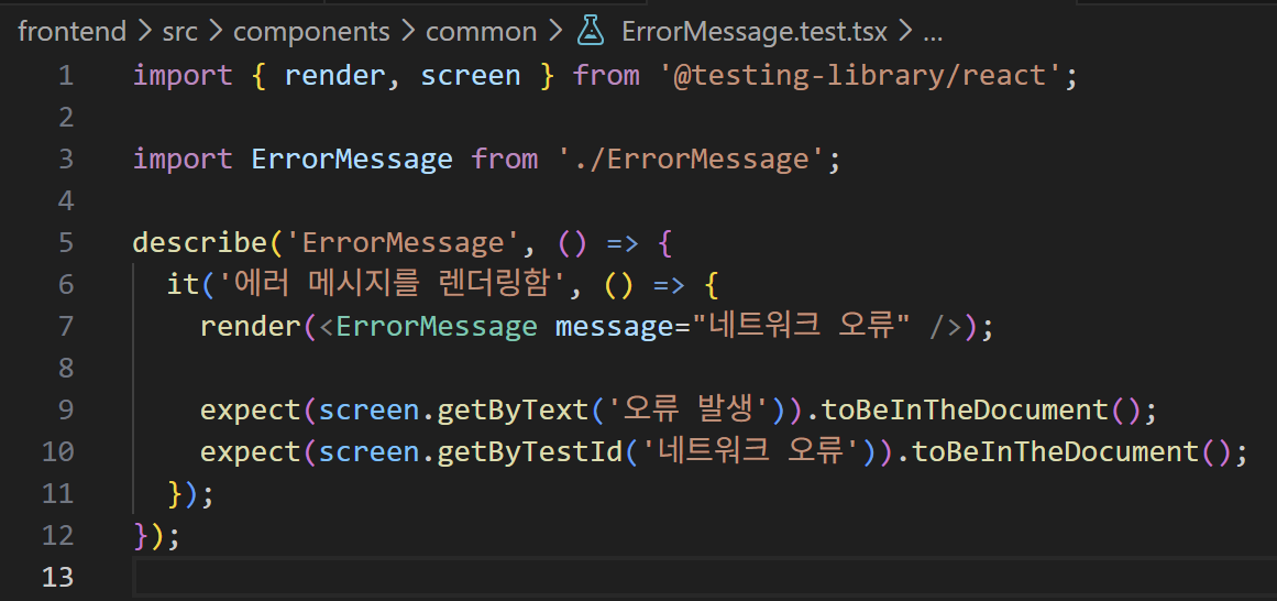 현재 지금 제 프로젝트에 있는 ErrorMessage.tsx가 있는데, 이걸 활용해서 테스트 파일을 만들고 테스트 해보는 겁니다.
